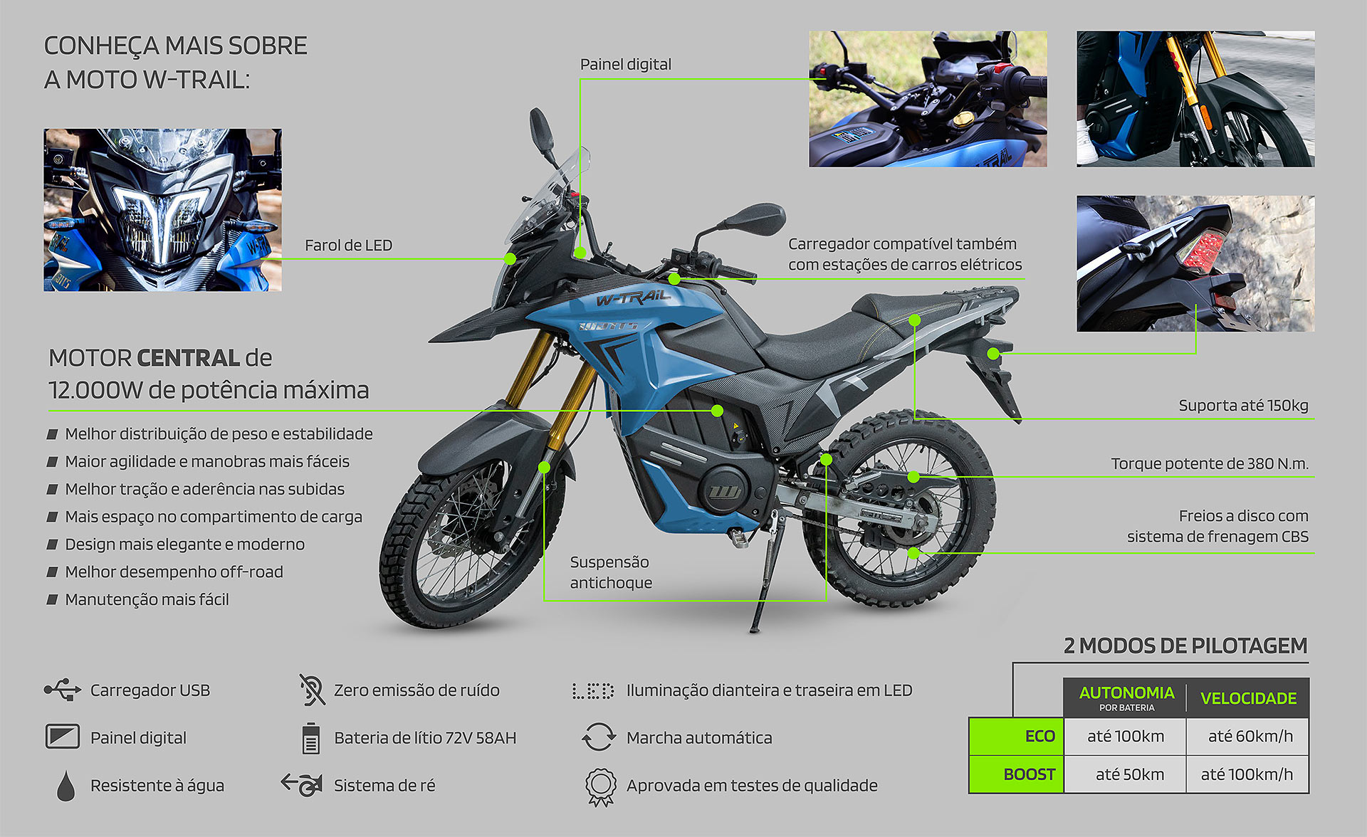 Pronta para qualquer terreno. Para quem deseja uma moto versátil com design arrojado. Seu motor elétrico de 12.000W de potência máxima (4.000W nominal) proporciona tranquilidade para passar por qualquer obstáculo. Além disso, a W-TRAIL atinge até 100km/h e suporta até 150kg.